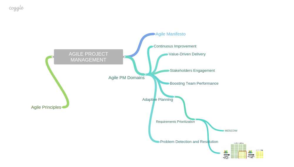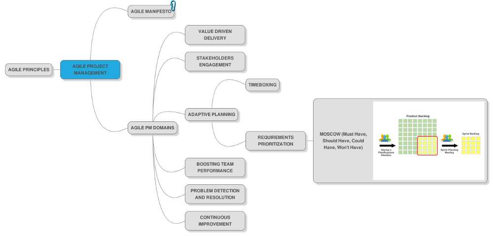 I posted two examples, one from Coggle and one from MindMup, of a simple mind map representing the Agile Project Management main concept based on the PMI-ACP® exam corpus, and developing the "adaptive planning" branch until the prioritization strategies for sprint backlog (MoSCoW method). Both tools allow me to add an image to the maps.